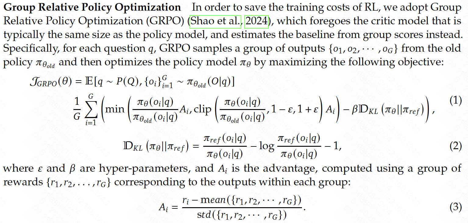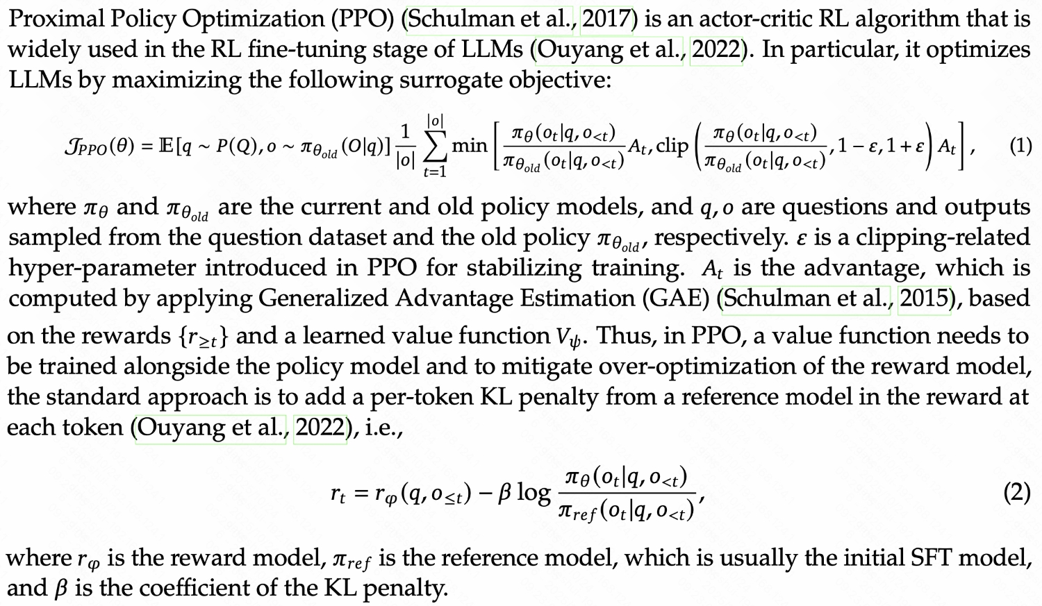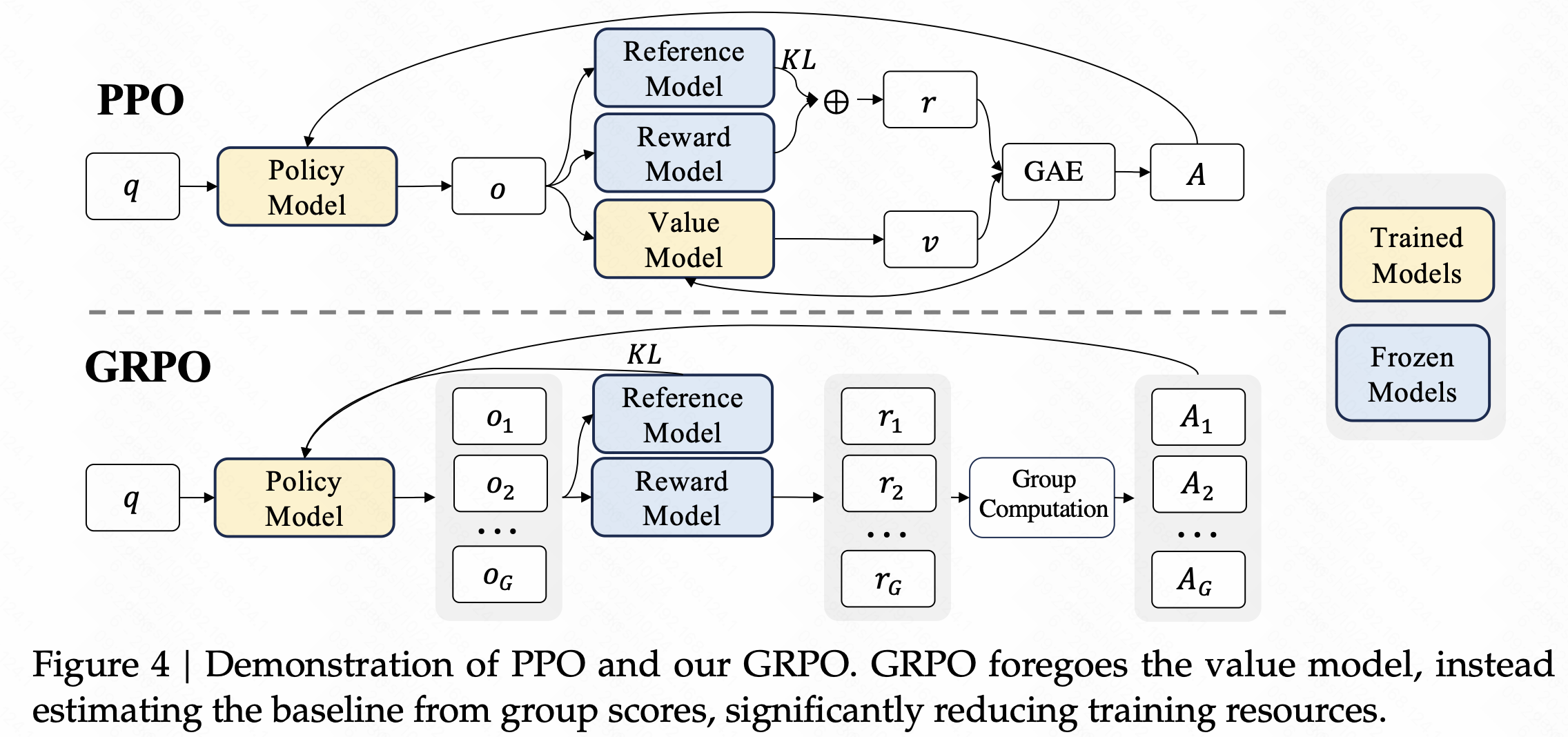 Deepseek在2024年的DeepseekMath论文中提出了GRPO(Group Relative Policy Optimization),在一定程度上能够通过去掉Value Model,缓解PPO对于显存的瓶颈,确保策略更新的稳定性和高效性;同时保留了Reward Model,避免了DPO因为直接拟合人类偏好数据,而容易造成的过拟合和效果不佳。