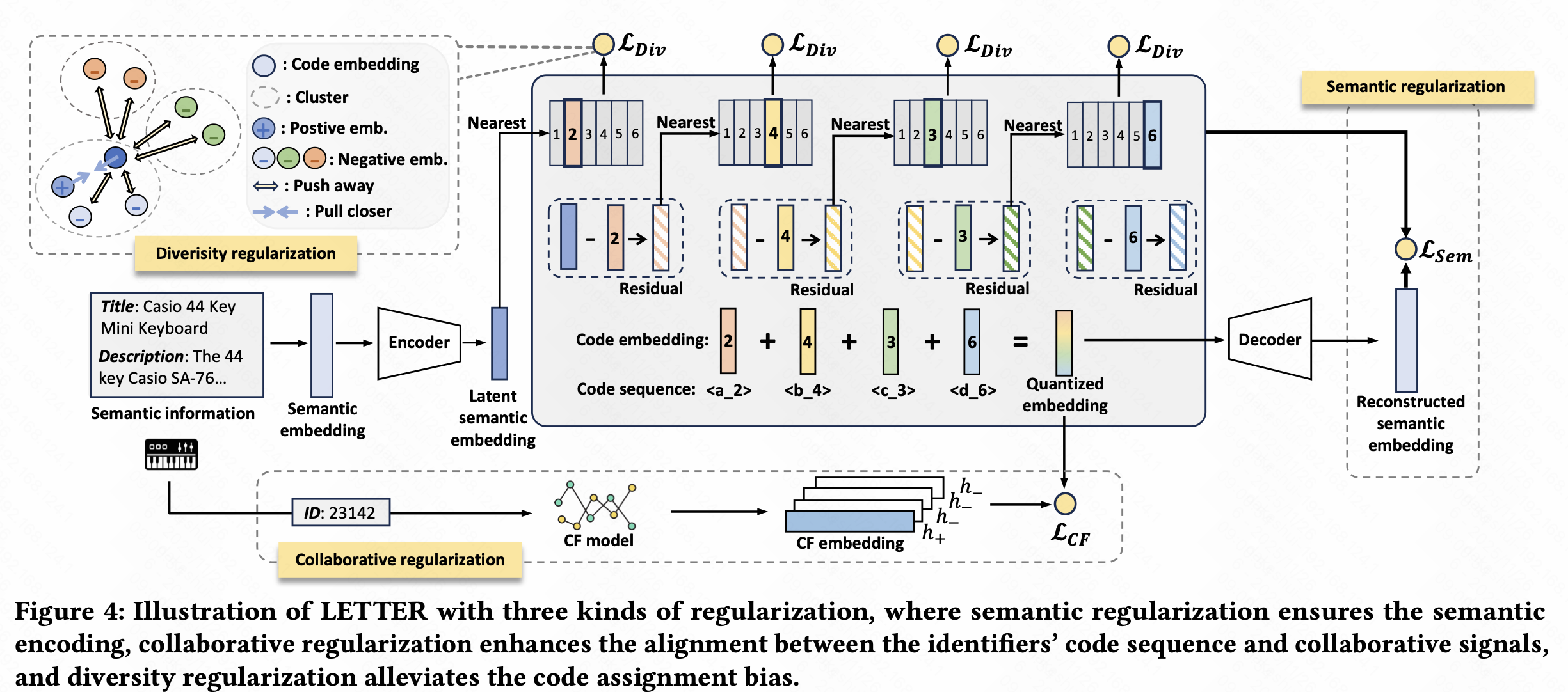 语义id特征入模的适配是一个语义和协同的对齐问题,目标是最大化来自LLM的语义表征和来自CF模型的协同表征之间的互信息。这意味着,在向量空间中,语义相似的物品,其协同表征也应相似;反之亦然。语义id的对齐中,通常是广告CF模型(多为user-item双塔、LTR模型)获得user/item协同表征embedding,对LLM获得的多模态内容表征进行量化时同时做U2I对齐和I2I对齐。