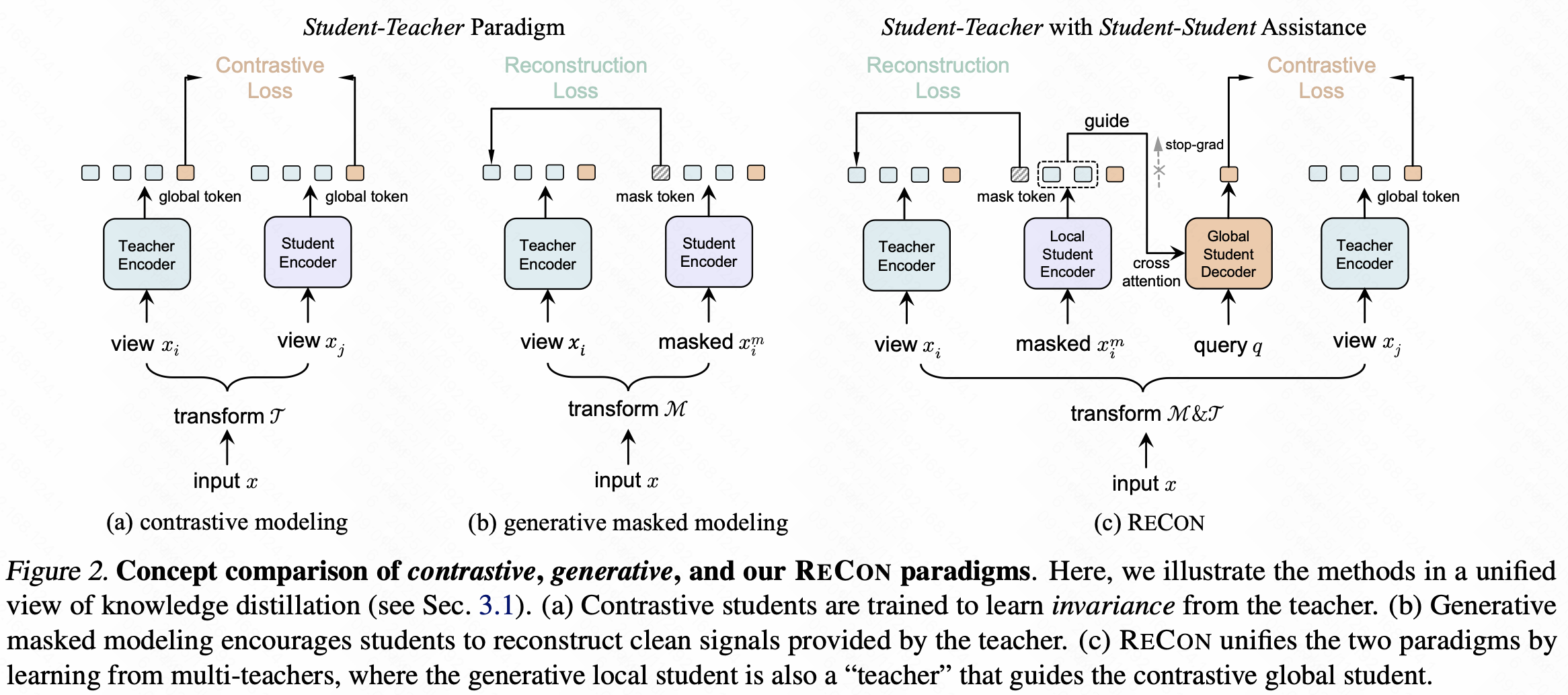ReCon等融合范式:统一了对比和生成式两种自监督范式,采用多教师蒸馏框架。对比式教师和生成式教师分别提供不同的监督信号,学生模型是使用一个统一的cf双塔模型同时向两位教师学习,目标是使自己输出的协同表征,既能通过对比学习区分正负,又能通过生成任务重构语义。